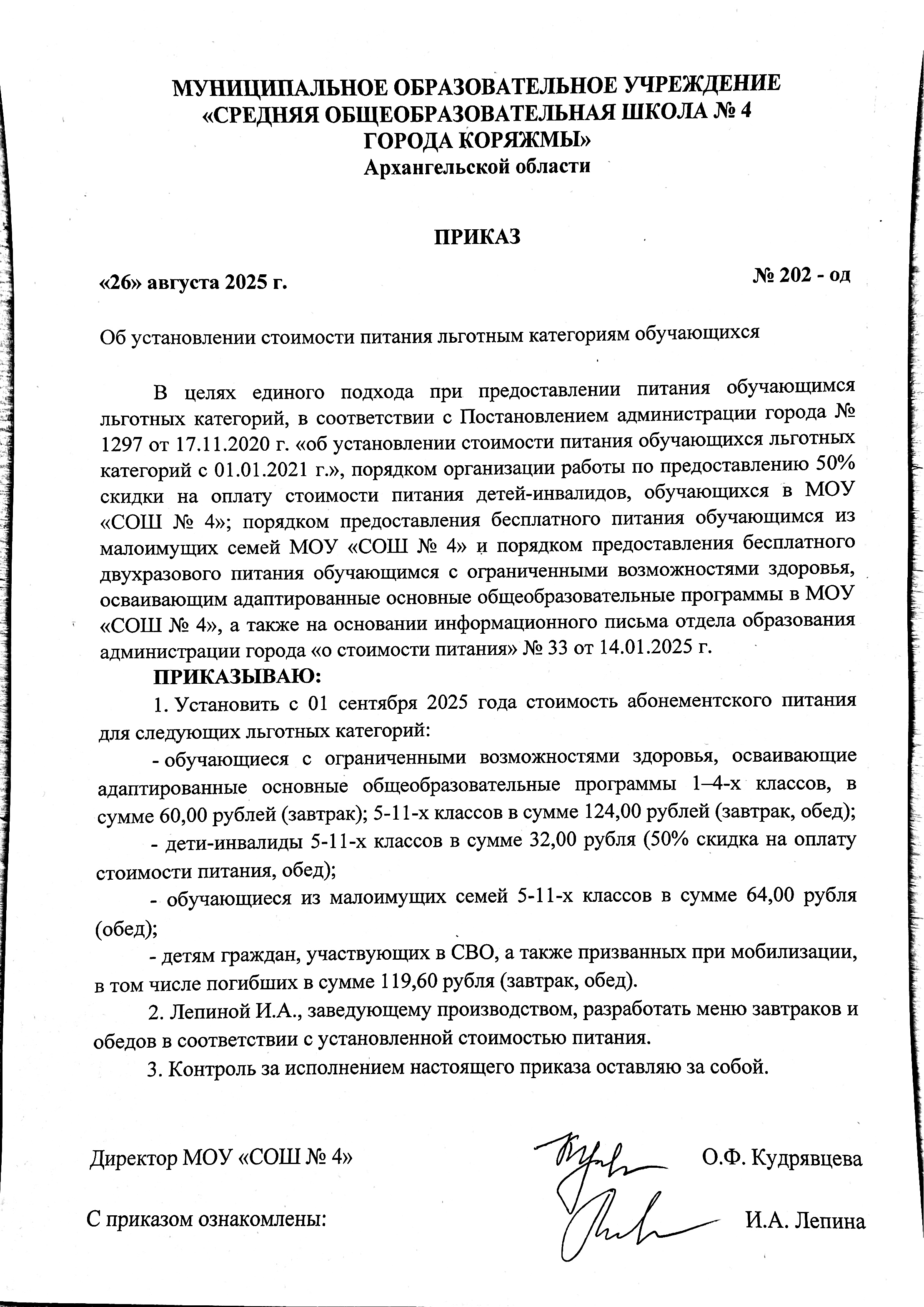 Приказ об организации питания в МОУ "СОШ № 4"